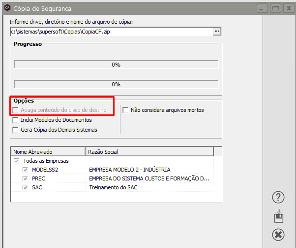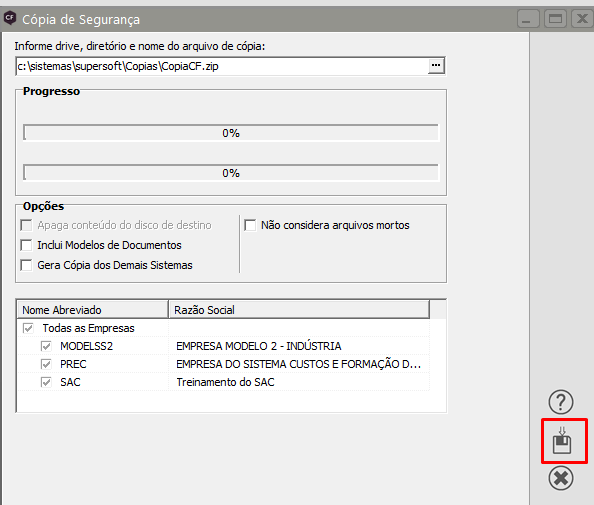 Na parte inferior são mostradas as empresas cadastradas nos sistemas. Por padrão, todas as empresas serão incluídas nas cópias de segurança. Caso alguma delas seja desmarcada, ela não será incluída na cópia. Desta forma é possível criar cópias de segurança contendo dados de apenas uma ou de um conjunto específico de empresas.
