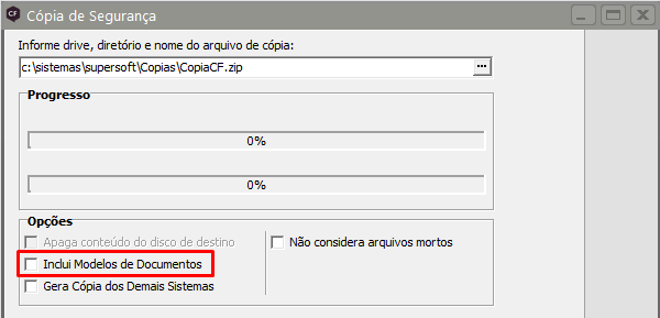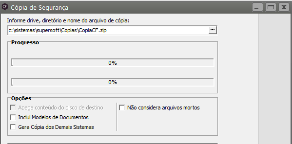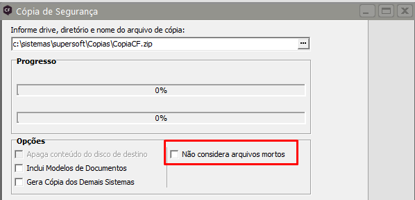 Caso seja preciso uma cópia de tamanho reduzido, pode ser assinalada a opção Não Considera Arquivos Mortos.