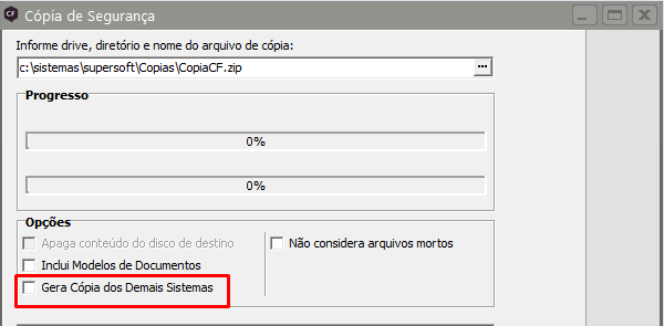Gera Cópia dos Demais Sistemas: Ao executar a rotina de cópia de segurança de um determinado sistema, automaticamente seja gerado a cópia dos demais, dispensando a necessidade de abrir um módulo por vez para a geração das mesmas.