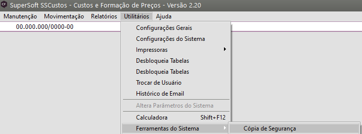 Para fazer a Cópia de Segurança entre no menu Utilitários/Ferramentas do Sistema/Cópia de Segurança.