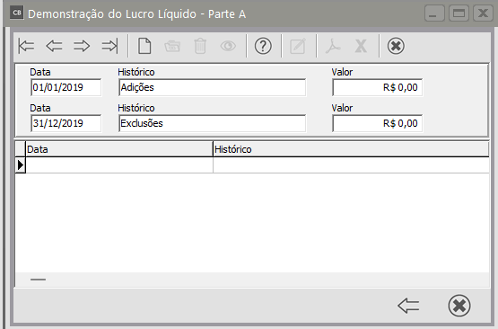 Em seguida surge uma janela com a barra de botões de edição (ferramentas) e um espaço abaixo, onde ficarão os registros dos lançamentos que compõem a Demonstração do Lucro Real.