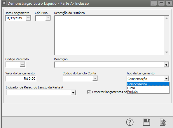 De forma semelhante aos Ajustes do Lucro Líquido a tela apresenta os mesmos campos com diferença apenas quanto ao "Tipo de Lançamento", onde deve ser escolhida uma das opções "Lucro" "Prejuízo" ou "Compensação", conforme o caso. Estes lançamentos também podem ser gerados de forma automática a partir da escrituração da Parte B do LALUR, como será exposto a seguir