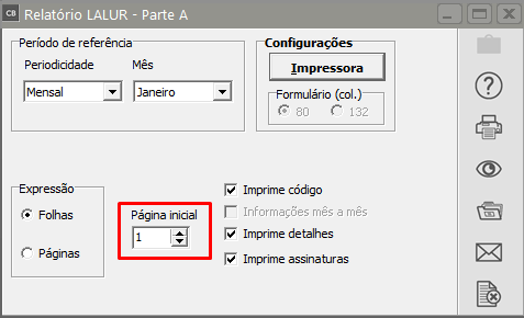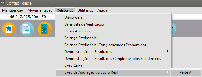 Como o livro é dividido em duas partes (A e B), a impressão do LALUR deve ser efetuada em duas etapas. Primeiro deve ser impressa a Parte A, composta dos Ajustes do Lucro Líquido da Demonstração do Lucro Real. Para iniciar basta fazer uso do menu Relatórios>Livro de Apuração do Lucro Real Parte A