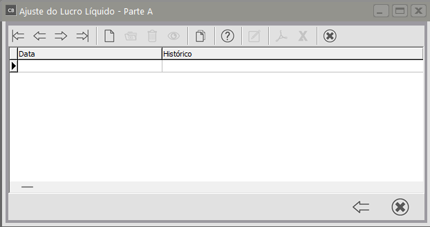 Em seguida surge uma janela com a barra de botões de edição (ferramentas) e um espaço abaixo, onde ficarão os registros dos lançamentos de Ajuste do Lucro Líquido previsto na legislação do Imposto de renda classificados como adições (a serem somados ao Lucro Líquido) ou exclusões (a serem diminuídos do lucro líquido). Utilize o botão "novo" para inserir os lançamentos.