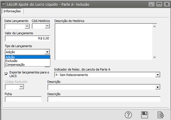 - No Tipo de Lançamento deve ser escolhida uma das opções "Adição" ou "Exclusão" conforme o caso