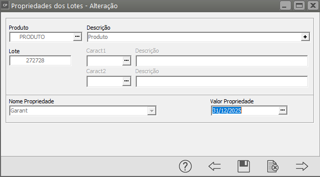 Será apresentada a tela para cadastro da Propriedade do Lote definida anteriormente, informe o código do produto, o lote do mesmo, e o valor da propriedade, que em nosso exemplo é a data do vencimento da garantia do lote.