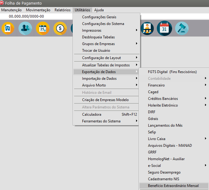Para realizar a Exportação do arquivo para o BEM (Benefício Extraordinário Mensal), acesse o menu Utilitários>Exportação de Dados>Benefício Extraordinário Bem