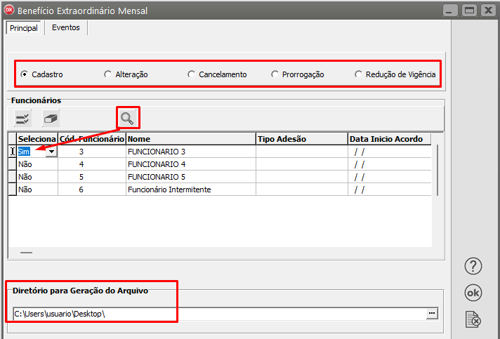 • Funcionários - Clique no botão com o desenho da Lupa e em seguida defina SIM para os funcionários que irá exportar para o BEM