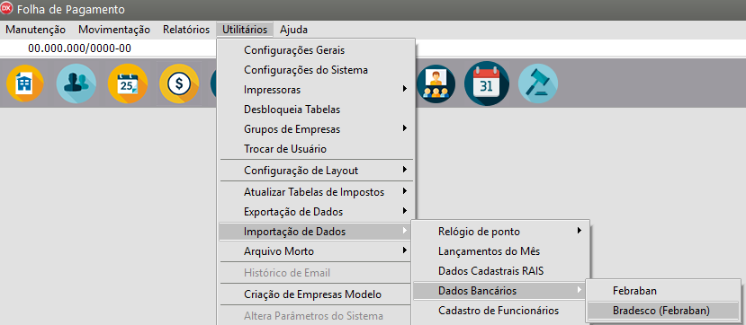 Para realizar a Importação de Dados Bancários Bradesco Febraban acesse o menu Utilitários>Importação de Dados>Dados Bancários>Bradesco (Febraban)