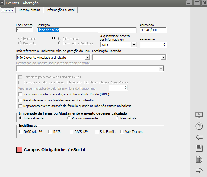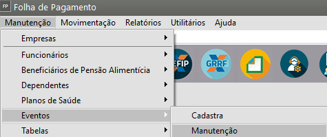 Para cadastrar um evento para Desconto de Plano de Saúde você deverá acessar o menu Manutenção>Eventos>Cadastra