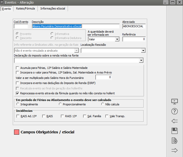 b) EVENTO DE ABONO PECUNIÁRIO DEMONSTRATIVO eSOCIAL - Verifique o primeiro evento disponível entre o e800 e e900 e faça o cadastro para o mesmo, conforme imagem abaixo