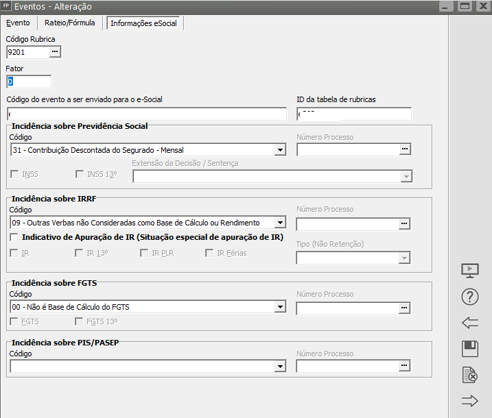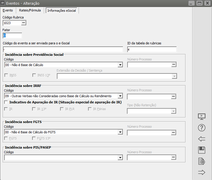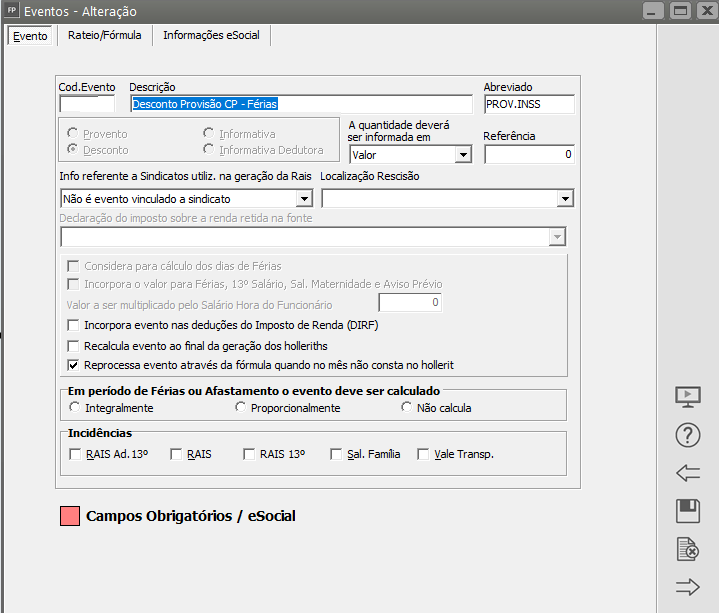 a) EVENTO DE DESCONTO - Verifique o primeiro evento disponível entre o e400 e e599 e faça o cadastro para o mesmo, conforme imagem abaixo