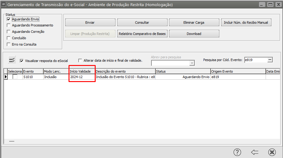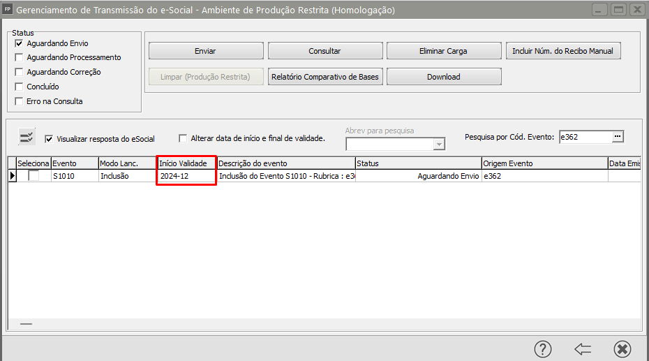 Acesse o Gerenciamento de Transmissão do eSocial filtre por Eventos Iniciais e verifique se foi criada a carga de inclusão dos eventos que você criou anteriormente