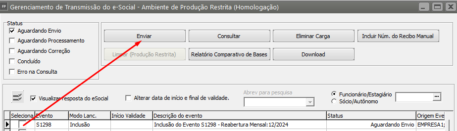 Após a geração do S-1298 faça o envio do mesmo para o Portal do eSocial e desta forma conseguiremos reabrir todas as folhas de pagamento que contenham as condições descritas acima