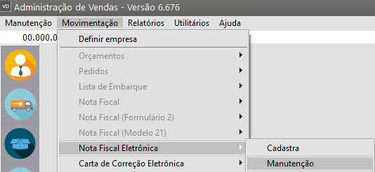 Acesse o menu Movimentação>Nota Fiscal Eletrônica>Manutenção