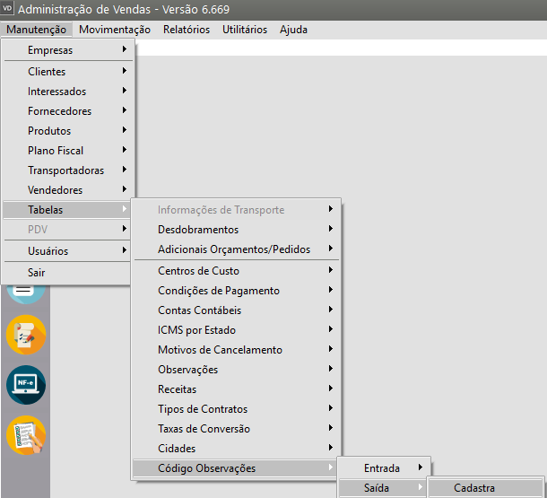 Para realizar o cadastro das Observações de Entrada você deverá acessar o menu Manutenção>Tabelas>Código Observações>Saída>Cadastra